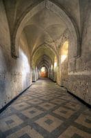 Een prachtige hal met doorkijk en pilaren in vervallen en verlaten klooster in Nederland.