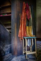 Aan de achterkant van de kelderdeur van een verlaten dokterswoning hangt deze oranje regenjas met daaronder gele laarzen.