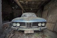 Een oude auto in een schuur van een verlaten boerderij.