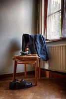 Stoel voor een raam op de 1e verdieping van een verlaten doktershuis.