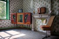 Een retro kamer op de eerste verdieping van een oude verlaten villa.