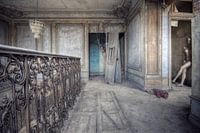 Een gang met een kristallen lamp die bijna naar beneden valt, een deur die nog net vast hangt en een oude paspop die zich lijkt te verstoppen in een kamertje.