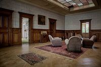 Een zitkamer op de bovenverdieping van een verlaten villa.
