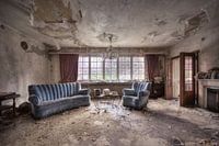 De woonkamer met baby blauwe vintage bank en stoel en een vervallen en verlaten huis.
