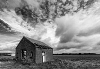 Urbex arbeidershuisje op de grens tussen België en Nederland in oost Zeeuws-Vlaanderen, provincie Zeeland. Contrastrijke zwart/wit foto met een prachtige dynamische wolkenlucht.