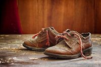 Een paar bestofte schoenen op een tafel in een oud verlaten huisje.