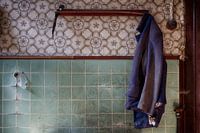 Een oude bestofte jas in de keuken van een oud en meer dan 30 jaar verlaten huisje. Met ernaast een bakelieten lichtschakelaar en het jaren 60/70 behang.
