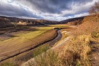 Lage waterstand in het stuwmeer bij Kamp Vogelsang in de Duitse Eifel