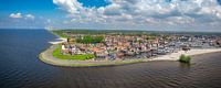 Luchtfoto van Urk, voormalig eiland in de Zuiderzee, tegenwoordig gelegen aan de oever van het IJsselmeer in Flevoland, Nederland tijdens een zonnige lentedag. Luchtfoto met de vuurtoren en het dorp erachter.