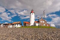 Vuurtoren van Urk gezien vanaf het Wateroppervlak met op de voorgrond de dijkbestrating in een mooi zonnetje