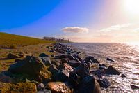 Urk langs de Ijselmeerdijk met de laagstaande zon rechts over het water.