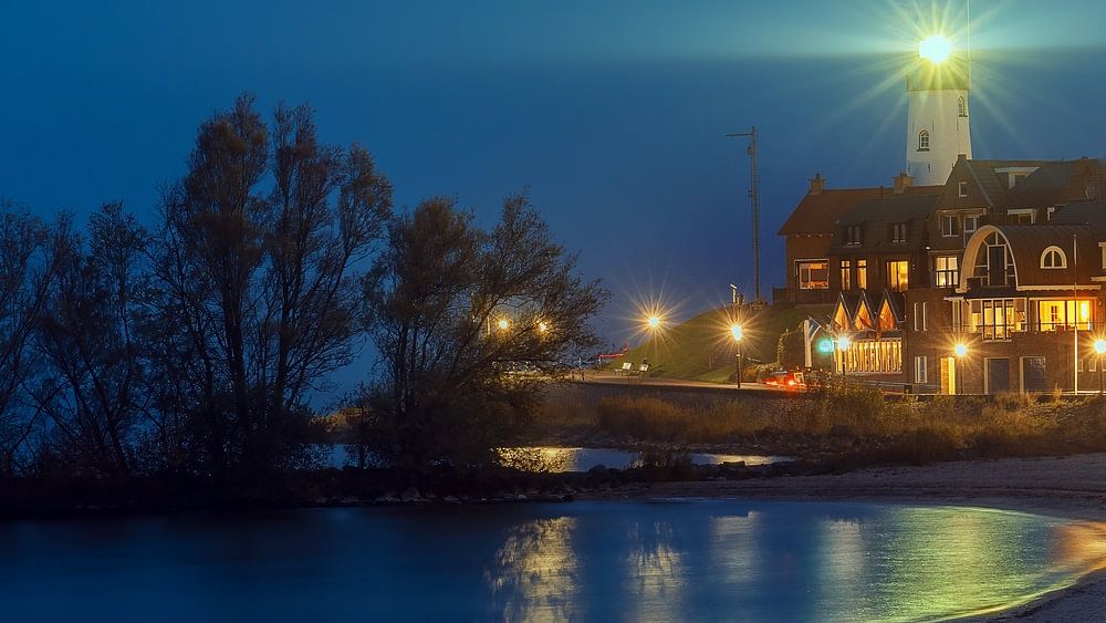 De vuurtoren van Urk heeft nieuwe led lampen. Foto gemaakt tijdens het blauwe "uurtje" dat geen uurtje is, meer een kwartier ;-) De verlichting reflecteert mooi in het water van het IJsselmeer.
