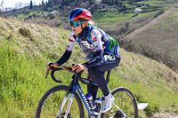 Urzka Zigart in haar nationale kampioenen trui op de flanken van LeTolfe één van de steilste klimmen uit de Strade Bianche.