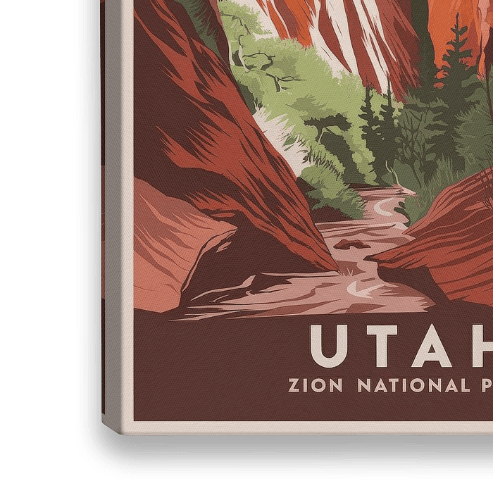 Majestueuze, gloeiende rode rotsen rijzen op in een harmonieus geheel, terwijl een rustige rivier door de vallei kronkelt. De vredige achtergrond van Utah's Zion National Park belooft avontuur en nabijheid tot de natuur. Dit kunstwerk is ideaal voor in de woonkamer, brengt een vleugje vrijheid en wekt reislust op bij elke kijker.