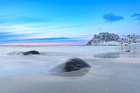 Het strand van Utakleiv in de Lofoten-archipel in Noorwegen aan het einde van een mooie winterdag. Golven stromen over de rotsen op de voorgrond met besneeuwde bergen op de achtergrond. Lang belichte foto met glad water. Utakleiv Beach is een van de beroemdste en meest pittoreske stranden van de Lofoten-archipel in Noorwegen. Utakleiv staat bekend om zijn verbluffende natuurlijke schoonheid en wordt vaak beschouwd als een van de mooiste stranden van het land.
