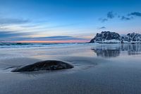 Koop de foto Utakleiv strand in de Lofoten archipel in Noorwegen bij zonsondergang van Sjoerd van der Wal Fotografie als print op canvas, aluminium dibond, (ingelijste) fotoprint, behang en ArtFrame. Voor jou op maat geprint in Fine-Art kwaliteit.