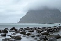 Het strand van Utakleiv, op de Lofoten in Noorwegen, ligt vol met grote zwarte stenen. Het was een regenachtige dag.