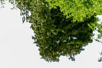 Boom weerspiegeld in een rimpelloze meertje. Oude Hortus Utrecht. Gemaakt op juni 2019