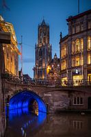 Centrum van Utrecht met de dom, grachten vanaf de bezembrug in de schemering