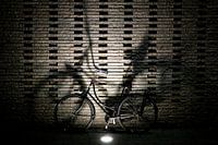 Utrecht is uitgeroepen tot tweede fietsstad ter wereld. Of dat terecht is weet ik niet, maar de stad ritselt wel van de fietsers en fietsenstallingen. De grootste fietsenstalling ter wereld onder Utrecht Centraal is al deels in gebruik en wordt binnenkort volledig opgeleverd. Hier heeft een waarschijnlijk jonge vrouw haar omafiets gestald in het straatlicht van het Stationsplein in Utrecht. De straatlamp schijnt een puist licht naar boven en werpt een harde schaduw van de fiets op de achterliggende muur.