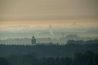 Een kleurenfoto van Utrecht zuid en Houten in de ochtend. De nevel geeft een prachtige sfeer. Je ziet hier de skyline van hoograven en Houten