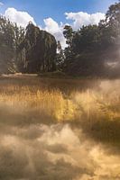 Een dubbele gelaagdheid van Utrechts landschap. Met mist op het veld. Het zonlicht op het midden van het pad en bomen en bosschage aan de horizon.