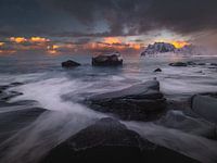 Een sfeervolle ochtend op Lofoten bij Uttakleiv Beach waar veel fotografen genieten van de aanwezige rotsen en besneeuwde bergen in de achtergrond. De mooie rotsen partijen nodigen je uit om mooie landschappen te maken. Veela kun je daar met lange sluitertijden werken om meer sfeer in je beeld te krijgen, De zon schijnt morgens op de besneeuwde bergen wat een warme gloed geeft. DE rotsblokken in zee die besneeuwd zijn geven een extra accent in de zee.