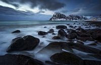 Uttakleiv rotsachtige kust met bergen op de achtergrond bij bewolkte zonsondergang, Noorwegen