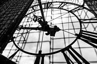 Zicht op de achterzijde van één van de uurwerken van de Martinitoren in de stad Groningen op een hoogte van 70 meter. Klok in de Martinitoren in Groningen. Deze foto is gemaakt in het najaar van 2013. Uitvoering in Zwart-wit.