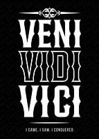 Deze afbeelding toont de beroemde Latijnse zin "VENI VIDI VICI" in een opvallend, decoratief lettertype op een zwarte achtergrond. De letters zijn wit en steken sterk af tegen de donkere achtergrond. Onder de hoofdwoorden staat de Engelse vertaling: "I CAME, I SAW, I CONQUERED". Een sierelement boven de tekst geeft het ontwerp een…