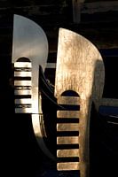 Foto van enkele gondels in Venetië, Italië. De Venetiaanse gondels zijn een herkenningspunt van de stad. Een mooie reflectie van het zonlicht is te zien in deze detailopname.