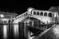 Midden in een lagune is de betoverende Italiaanse stad Venetië gebouwd op meer dan 100 eilanden. Deze eilanden zijn met elkaar verbonden door meer dan 400 bruggen, en meer dan 150 kanalen dienen als straten. De Rialtobrug is een van de beroemdste bouwwerken en overspant het Canal Grande, dat bijna vier kilometer lang is. Mooie monochrome opname in de stilte van de nacht.