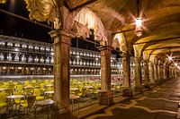 Midden in een lagune is Venetië gebouwd op meer dan 100 eilanden. Deze eilanden zijn met elkaar verbonden door meer dan 400 bruggen en meer dan 150 kanalen dienen als straten. Het San Marcoplein is het belangrijkste en bekendste plein van Venetië. Het werd al in de 9e eeuw aangelegd. Prachtig uitzicht door de arcades over het San Marcoplein - 's nachts verlaten. Een droomachtige sfeer!