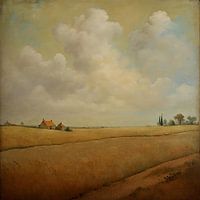 HET SCHILDERIJ TOONT EEN OPEN LANDSCHAP MET DREIGENDE WOLKEN MAAR TOCH EEN VLEUGJE OPEN LUCHT. DE COMPOSITIE STRAALT UITGESTREKTHEID EN MYSTERIE UIT.