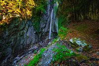 Weelderige vegetatie bij een verborgen kleine waterval in de Zwitserse Alpen.