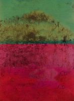 HET DIGITAAL SCHILDERIJ TOONT EEN RUSTGEVEND LANDSCHAP MET EEN PRACHTIG CONTRAST TUSSEN EEN DIEPROOD EN EEN WEELDERIG GROEN VLAK. OP DE ACHTERGROND RIJST EEN MAJESTUEUZE BERG OP, GEHULD IN MYSTERIE.