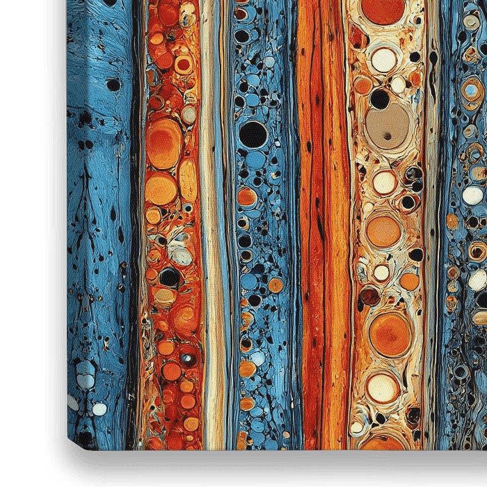 Dit fascinerende abstracte kunstwerk, "Vertical Strata", is een ode aan kleur, beweging en organische vormen. Krachtige verticale banden in diepblauw, levendig oranje en crèmekleurige neutralen zijn verweven met ingewikkelde cirkelvormige motieven, waardoor een betoverend gevoel van ritme en diepte ontstaat. De dynamische compositie van…