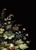 Versie D4a. Mijn botanische stilleven toont een verscheidenheid aan planten en bloemen tegen een zwarte achtergrond. De foto wordt gedomineerd door groene tinten met een vleugje bruin en wit. De planten zijn losjes en organisch gerangschikt, wat een gevoel van natuurlijke schoonheid en rust overbrengt. ©10-2024 Pia Schneider, atelier…