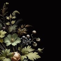 Versie D4b. Mijn botanische stilleven toont een verscheidenheid aan planten en bloemen tegen een zwarte achtergrond. De foto wordt gedomineerd door groene tinten met een vleugje bruin en wit. De planten zijn losjes en organisch gerangschikt, wat een gevoel van natuurlijke schoonheid en rust overbrengt. ©10-2024 Pia Schneider, atelier…