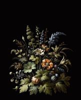 Een levendig en weelderig bloemstuk tegen een diepzwarte achtergrond. Het boeket bevat een verscheidenheid aan bloemen, waaronder delicate witte anemonen met een geel hart, een opvallende oranje klaproos met een opvallend geel hart en enkele kleinere paarse bloemen. Weelderig groene bladeren en stelen zorgen voor diepte en textuur,…