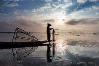VISSER BIJ ZONSOPGANG vist OP TRADITIONELE MANIER OP HET INLE MEER IN MYANMAR. Met een korf wordt de vis gevangen nadat hij visueel is gedetecteerd. Dan wordt diverse malen een speer door de korf gestoken totdat de vis is gevangen.