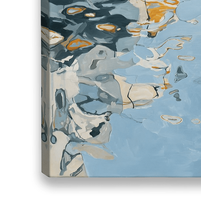 Haal de rustgevende schoonheid van water in huis met dit betoverende abstracte schilderij, "Reflections in Motion". Geïnspireerd door de steeds veranderende dans van licht op water, combineert dit kunstwerk op meesterlijke wijze koele blauwtinten, zachte grijstinten en levendige oranje en gouden accenten voor een betoverende visuele ervaring.