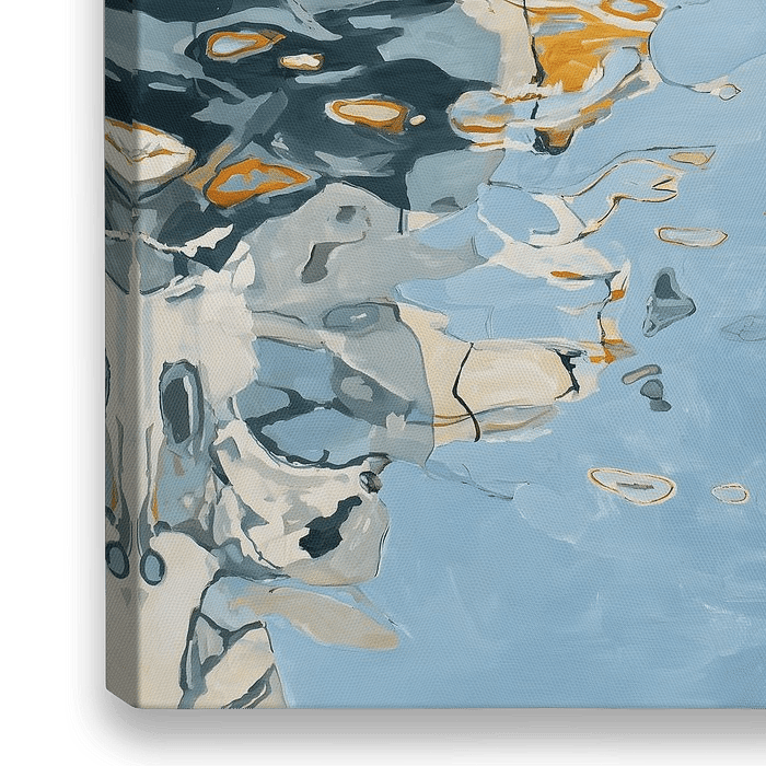 Haal de rustgevende schoonheid van water in huis met dit betoverende abstracte schilderij, "Reflections in Motion". Geïnspireerd door de steeds veranderende dans van licht op water, combineert dit kunstwerk op meesterlijke wijze koele blauwtinten, zachte grijstinten en levendige oranje en gouden accenten voor een betoverende visuele…