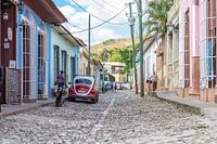 Oude VW Kever op een weg in Trinidad, Cuba
