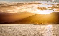 Het Arctisch (Artic Circle) gebied toont goud wanneer de zon net boven de bergen uit komt. Op een mooie winter dag als de zon niet meer op is dan enkele uren. Tussen de poolcirkel en de Noordkaap (Nordkap)! Prachtig zonneharpen beschijnen het land als op deze winterdag de zon op z'n hoogste punt staat