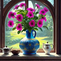 Vaas bloemen in de vensterbank met fel invallend zonlicht.