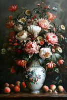 De vaas zelf is afgebeeld met verfijnde details, waardoor het geheel een harmonieus en uitnodigend beeld vormt. De achtergrond is subtiel en rustig, wat de kleuren van de bloemen doet stralen.