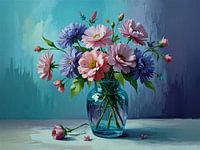 Dit is een digitaal kunstwerk van 1 glazen vaas gevuld met kleurrijke bloemen. De vaas staat op een tafel in een kamer. Op tafel ligt een losse bloem. Mooie rustgevende blauwe achtergrond. Een sfeervol en romantisch beeld geschikt voor de woonkamer.