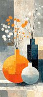Vaas met oranje bloemen - Op dit bloemen schilderij zie je een grote oranje vaas met takken die oranje en witte bloemen dragen, op een achtergrond van grijze en blauwe tinten.