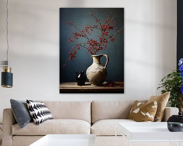Een vaas prijkt op het schilderij, omringd door levendige rode besjes. De vaas straalt rust uit met zijn diepe blauwe tint, terwijl de besjes een speels contrast bieden, als heldere accenten die het geheel tot leven brengen. De compositie wekt een gevoel van sereniteit en levendigheid op.